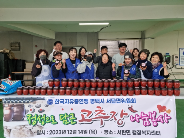 [금요저널] 자유총연맹 평택시지부 서탄면분회는 지난 14일 서탄면 행정복지센터에서 회원과 자원봉사자 등 20여명이 참석한 가운데 ‘이웃사랑 고추장 담그기’ 행사를 개최했다.