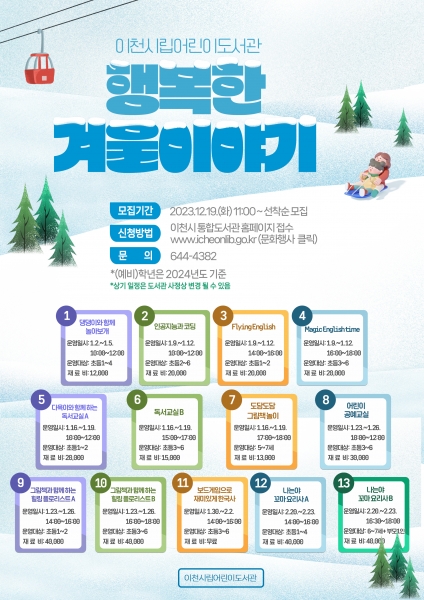 [금요저널] 이천시 어린이도서관은 내년 1월 2일부터 2월 23일까지 겨울방학을 맞이한 어린이들에게 다양한 교육 기회를 제공하고 방학기간 도서관 이용 활성화를 위해 ‘2024년 어린이도서관과 함께하는 행복한 겨울이야기’ 프로그램을 운영한다.