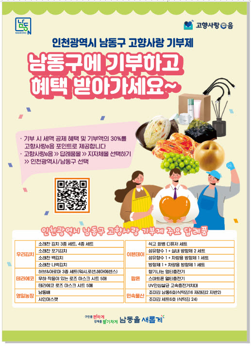[금요저널] 인천시 남동구는 고향사랑 기부제 활성화와 기부자의 답례품 선택의 폭을 넓히기 위해 2024년 남동구 답례품 공급업체를 모집한다고 19일 밝혔다.