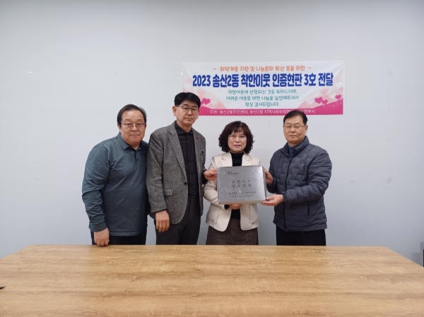 송산2동주민센터로 연 100만원 이상 또는 분기 1회 이상 기부한 업체 및 상점을 대상으로 ‘착한이웃 인증업체’ 현판을 주문제작해 전달한다.