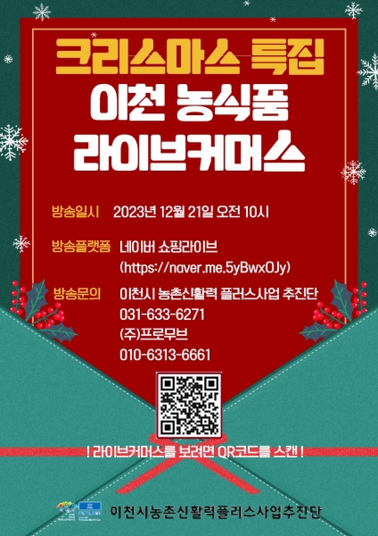 오는 21일 이천시 농촌신활력 플러스사업 추진단은 2023년 크리스마스를 맞이해 이천시의 우수 농산품을 활용한 신상품을 최근 소비 트렌드에 발맞추어 라이브커머스를 활용해 소비자들에게 1시간 동안 소개할 예정이다.