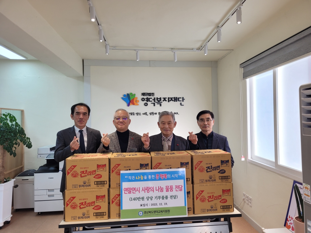 □ 영덕교육지원청(교육장 윤인한)은 19일 겨울을 맞아 관내 복지재단에 140만원 상당의 생필품(라면, 통조림 등 식료품) 기부식을 진행했다.