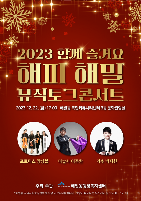[금요저널] 세종특별자치시 해밀동이 주민들을 위한 특별한 크리스마스 공연 ‘2023 함께 즐겨요 해피해밀 뮤직토크콘서트’를 준비했다.