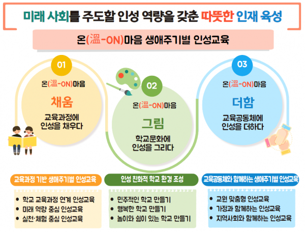 경북교육청은 ‘온 마음 생애주기별 인성교육’의 실천을 위해 교육과정 기반 생애주기별 인성교육 인성 친화적 학교 환경 조성 교육공동체와 함께하는 생애주기별 인성교육 등 3개 과제를 중점적으로 추진할 계획이다.