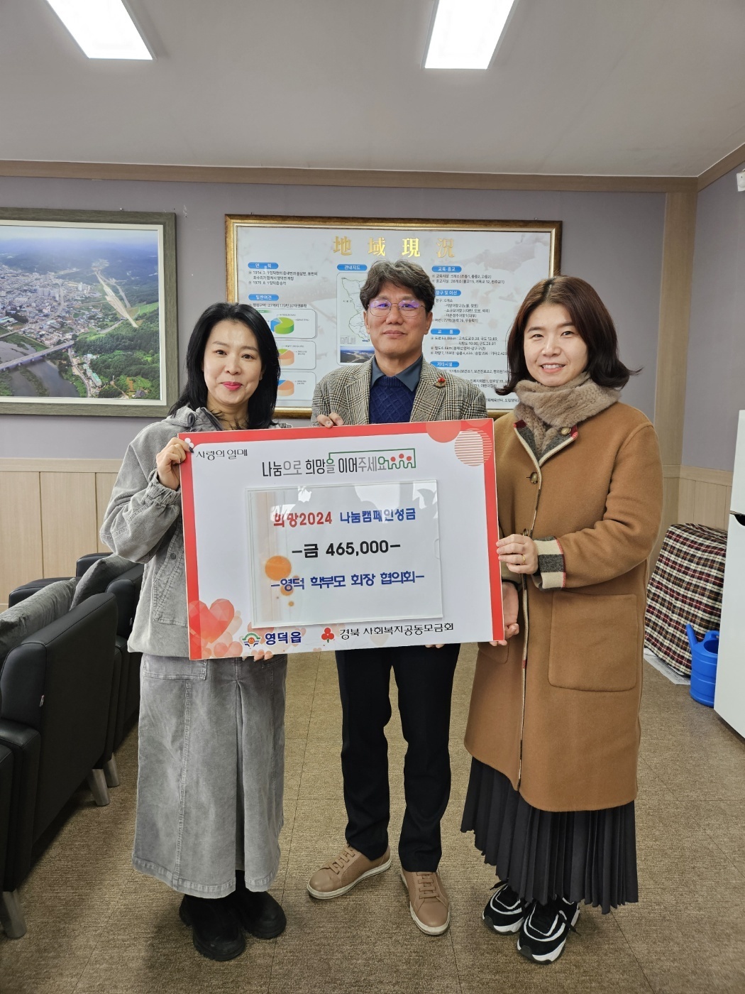 □ 영덕학부모회장협의회(회장 김수정)은 12월 19일(화), ‘희망 2024 나눔캠페인’에 동참하며 성금을 기부하였다. 지난 10월 24일 영덕교육지원청 주관으로 이루어진 해파랑 가을 음악회에서 관내 학부모들이 떡볶이와 어묵을 판매하고 얻은 수익금 전액(465,000원)을 영덕읍사무소(읍장 박현규)에 전달했다.