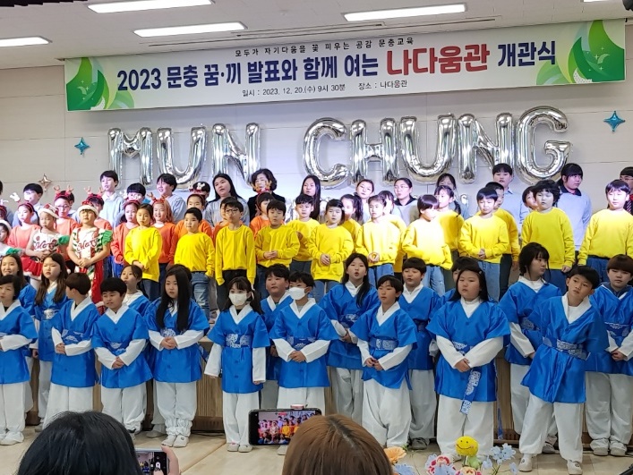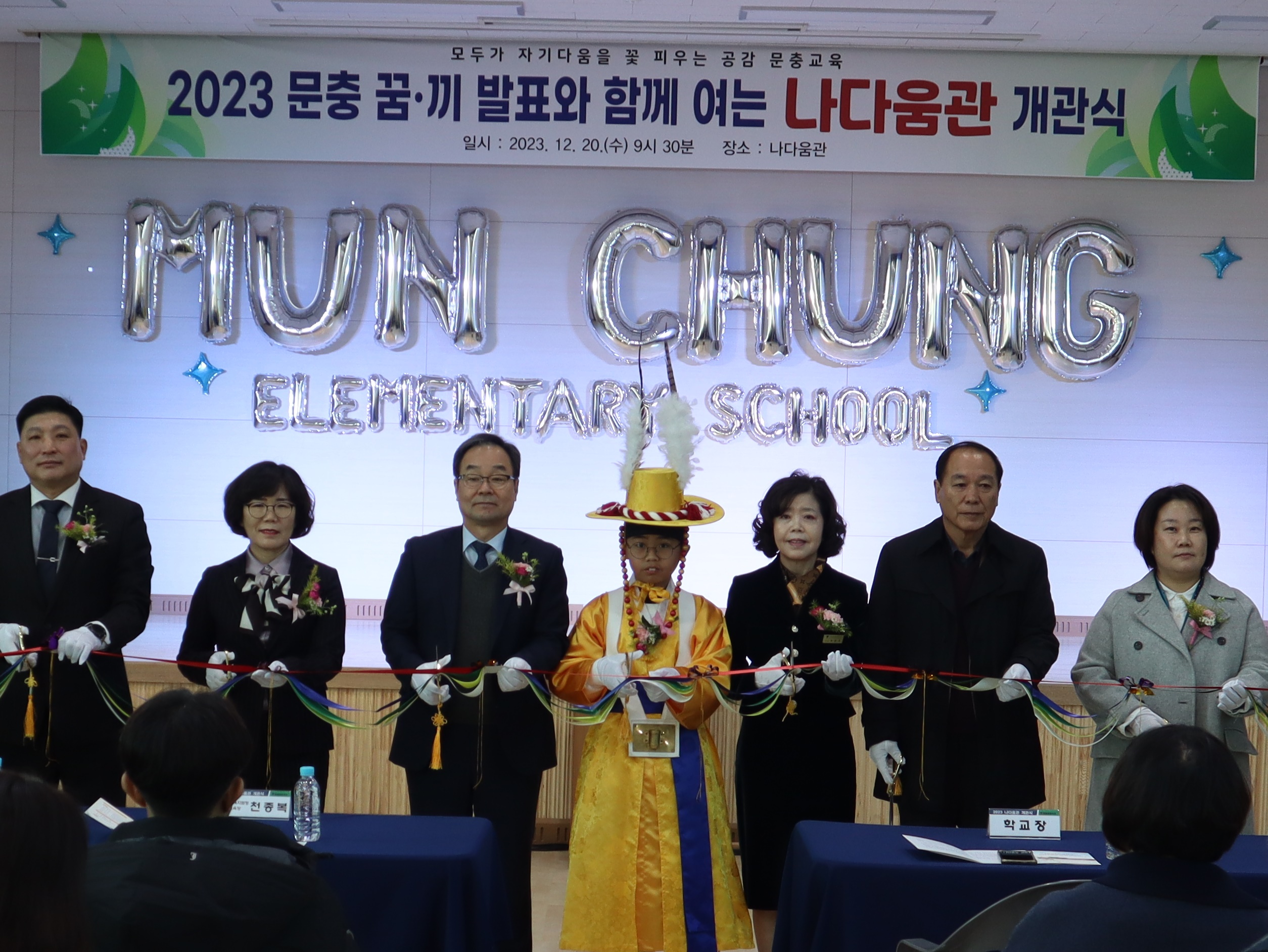 - 문충초등학교(교장 박현주)는 12월 20일(수) 포항교육지원청(교육장 천종복), 초등교장협의회(회장 김도경), 문충총동창회(간사 이동건), 행정복지센터(읍장 신강수) 및 관내 학교장을 비롯한 학부모 100여명이 참석한 가운데 다목적강당“나다움관”의 개관식과 꿈‧끼 발표회를 실시하였다.