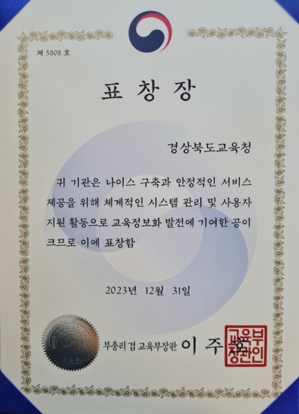 [금요저널] 경북교육청은 4세대 나이스 개통과 운영에 이바지한 공로를 인정받아 부총리 겸 교육부 장관 우수 기관상과 개인 7명 표창을 받았다고 21일 밝혔다.