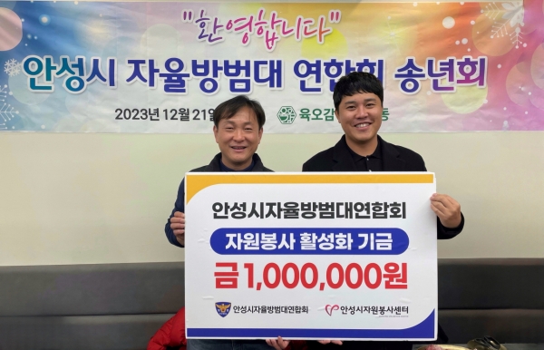 [금요저널] 지난 21일 안성시자율방범대연합회가 안성시자원봉사센터에 지역사회 자원봉사활성화기금 일백만원을 기탁해 전달식을 진행했다.
