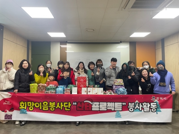 [금요저널] 평택시 공무원 자원봉사동아리 ‘희망이음봉사단’은 23일 성탄절을 맞이해 관내 아동학대, 가정폭력 피해자 13명에게 크리스마스 선물을 전달했다고 밝혔다.