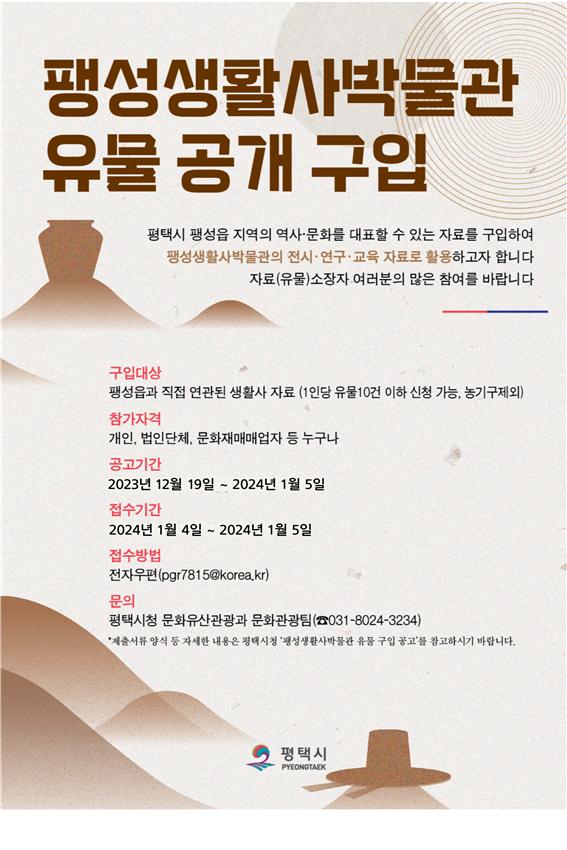 [금요저널] 평택시는 지난 19일부터 2024년 1월 5일까지 팽성생활사박물관 전시 및 교육자료로 활용할 수 있는 생활사 유물을 공개 구입하고 있다고 밝혔다.