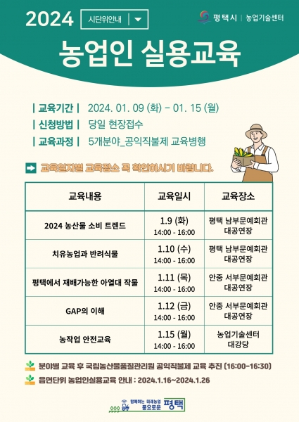 농업인 실용교육은 9일 2024 농산물 소비 트렌드 교육을 시작으로 10일 치유농업과 반려식물 11일 평택에서 재배가능한 아열대 작물 12일 GAP의 이해 15일 농작업 안전교육이 추진되며 공통과목으로 ‘공익직불제 의무교육’을 진행한다.