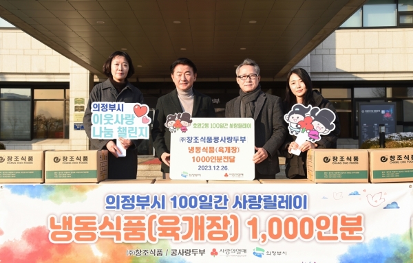 [금요저널] 의정부시는 12월 26일 ㈜창조식품·콩사랑두부가 ‘100일간 사랑릴레이 배턴 잇기’에 동참해 호원권역 취약계층을 위한 냉동식품 1천인분을 기탁했다고 밝혔다.