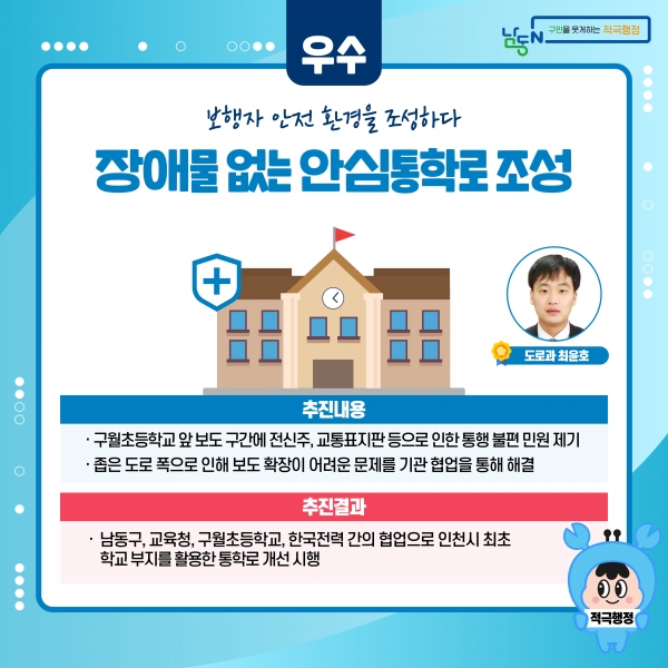 구는 선정된 우수사례를 웹툰과 카드 뉴스로 제작해 홈페이지와 남동구 블로그 등을 통해 홍보하고 선발된 공무원에게는 성과급 최고등급 및 포상 휴가를 인센티브로 부여할 예정이다.