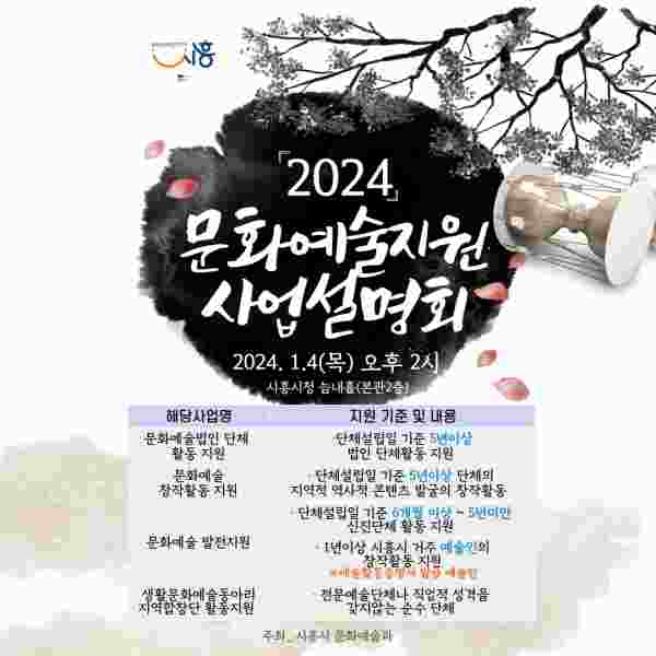 [금요저널] 시흥시는 ‘2024년 문화예술지원 공모사업 설명회’를 오는 1월 4일 오후 2시 시청 늠내홀에서 개최한다.