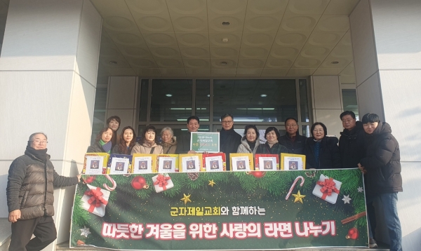 라면 전달식에는 윤성덕 군자제일교회 목사 외 성도 9명이 함께해 마음을 전했다.