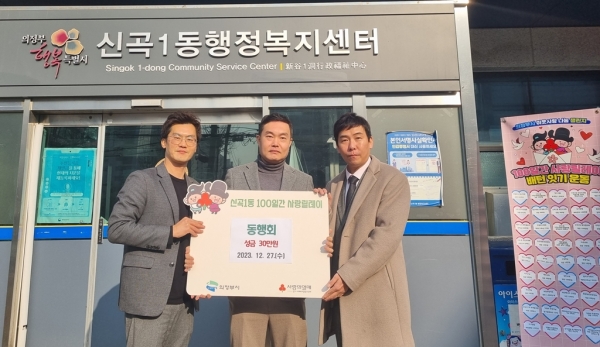 [금요저널] 의정부시 신곡1동행정복지센터는 12월 27일 봉사단체 동행회가 성금 30만원을 기부하며 ‘100일간 사랑릴레이 배턴 잇기’에 동참했다고 밝혔다.