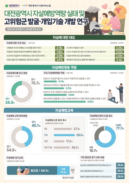 이번 조사결과는 대전시의 자살예방 역량 실태와 고위험군 발굴·개입기술 개발의 근거자료로 활용될 예정이다.