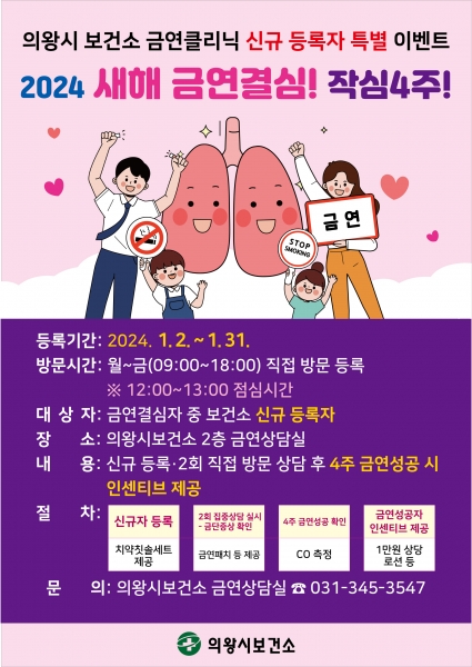 [금요저널] 의왕시보건소가 새해를 맞아 금연을 결심한 시민을 위해 ‘새해맞이 금연결심 작심 4주 특별이벤트’를 운영한다.