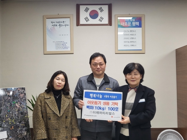 [금요저널] 평택시 청북읍에 소재한 ㈜이레머티리얼스는 지난 28일 청북읍 행정복지센터를 방문해 백미 100포를 기탁했다.