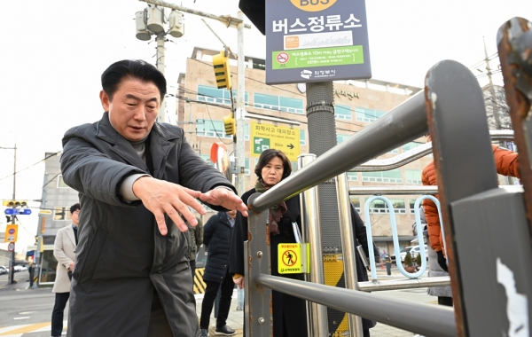 김동근 시장은 안전한 등하굣길 조성을 위해 보호구역 내 사설 표지판 제거, 불필요한 지주대 정비, 마을버스 정류장 2곳에 버스 베이 설치 등을 꼼꼼히 확인했다.