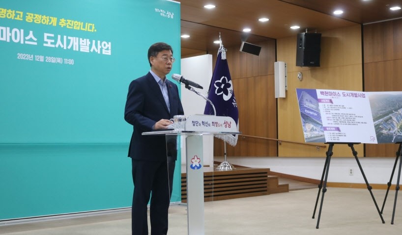 신상진 성남시장이 28일 '백현마이스 도시개발사업'과 관련해 "사업이 자칫 무산될 위기도 있었지만 연대책임 요구를 끝까지 철회하지 않았다"며 "부정부패 비리가 발붙이지 못하도록 끝까지 공정하고 투명하게 사업을 완수하겠다"고 강조했다.