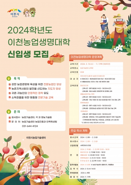 [금요저널] 이천시농업기술센터는 전문농업인 양성과 귀농귀촌인의 안정적인 정착을 위해 2024학년도 제17회 이천농업생명대학 신입생을 모집한다.
