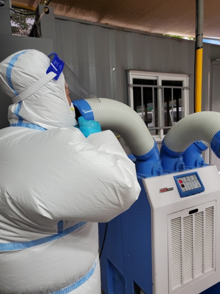 한여름 폭염에는 두꺼운 방역복을 입고 화장실을 가지 않으려고 물 마시는 것도 참아야 했고 기나긴 장마철에는 정강이까지 차오르는 물에 잠기면서 누전이라도 되면 어쩌나 비바람에 천막이 날아갈까 모래주머니로 천막을 단단히 묶기도 했다.