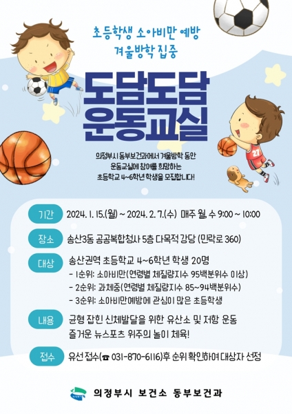 [금요저널] 의정부시 보건소는 송산권역 초등학교 4~6학년 학생 20명을 대상으로 운영하는 소아비만 예방 겨울방학 집중 ‘도담도담 운동교실’의 참가자를 모집한다.