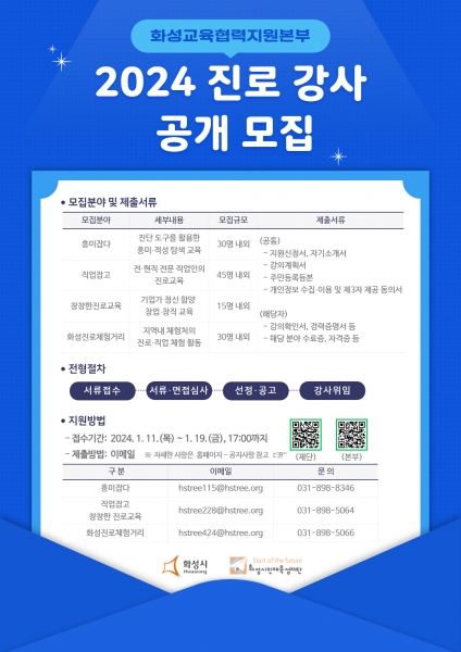 [금요저널] 화성시인재육성재단 화성교육협력지원본부는 2024년 진로교육 지원 사업을 함께 할 진로강사를 모집한다고 8일 밝혔다.