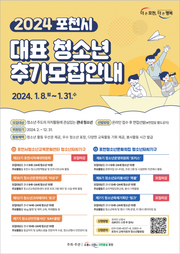 [금요저널] 포천시 공공 청소년수련시설는 오는 31일까지 ‘2024년 포천시 대표 청소년’ 활동에 참가할 청소년을 추가로 모집한다.