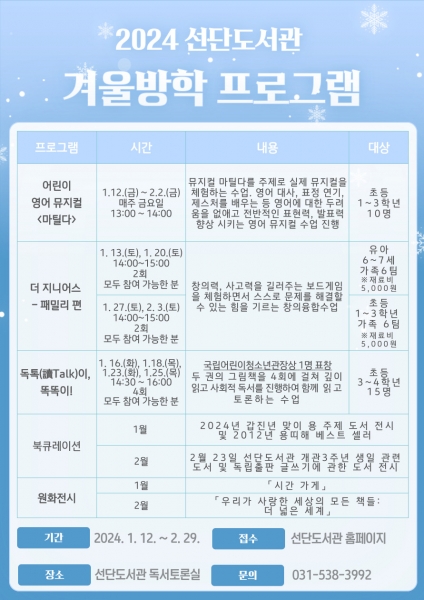[금요저널] 포천시 선단도서관은 오는 12일부터 2월 3일까지 겨울방학을 맞아 ‘품격있는 인문도시’에 걸맞은 다채로운 독서문화 프로그램을 운영한다.