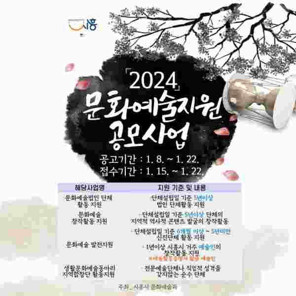 ‘2024 문화예술지원 공모사업’은 지역예술인 및 단체지원을 통해 문화 상생 토대를 구축해 지역예술을 활성화하고 시민에게 지역과 일상에서 문화를 누릴 기회를 제공하는 사업이다.