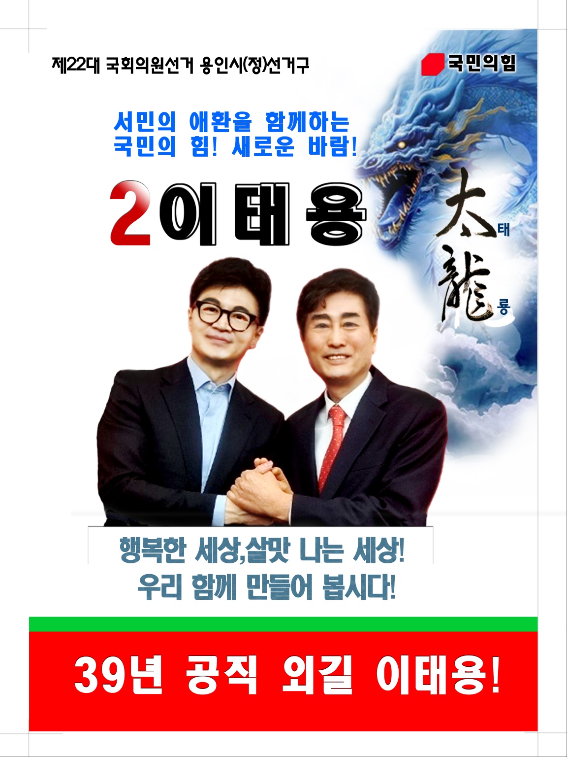 ‘국민의힘’의 새로운 정치, 저 이태용이 시민들 곁에서 그 해답을 찾아내겠습니다. 이번 총선에서 반드시 승리하여 국민의 여망에 부응하는 일꾼다운 일꾼이 되겠습니다. 지켜봐 주시고 힘차게 응원해 주십시오. 감사합니다.