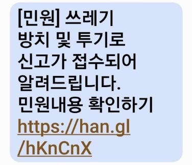 문자 메시지에는 ‘민원내용 확인하기’라는 문구와 함께 특정 링크를 클릭하도록 유도하고 있다.