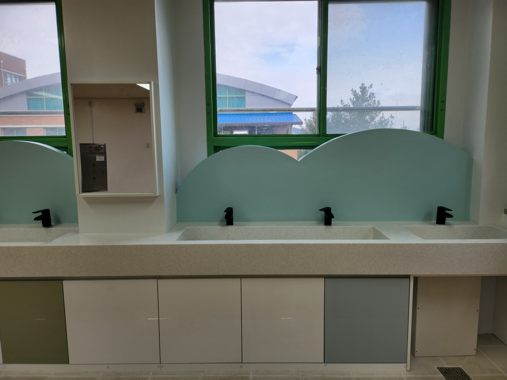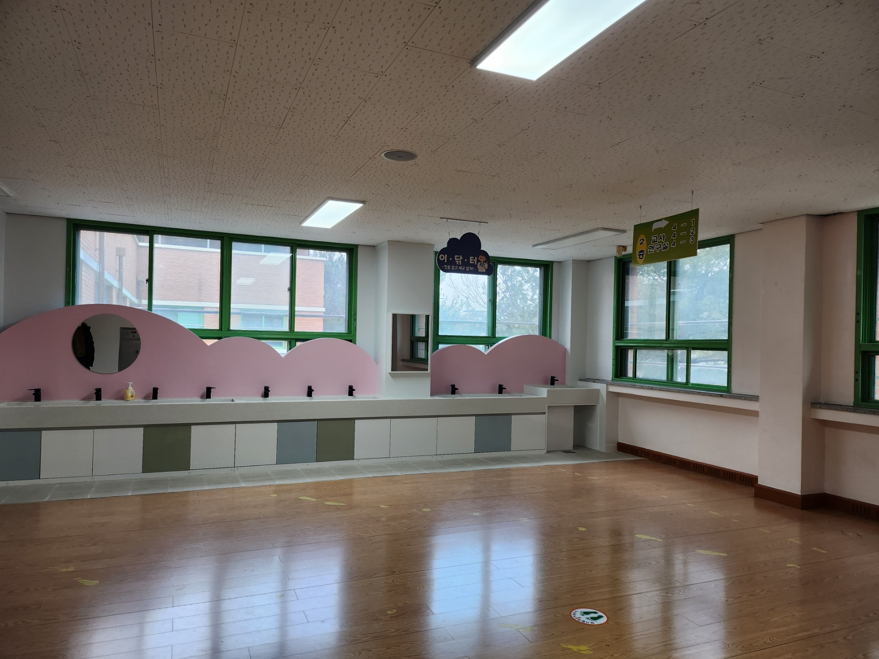 □ 이번 완료한 초등학교 양치시설은 식사 후 학생들의 이동 동선을 고려하여 각층 복도에 설치해 학생들의 접근성을 높였으며, 학생 성장을 고려하여 저학년과 고학년 세면대 높이를 차등 적용함으로써 사용의 편의성 높였고, 학생들의 안전을 위해 미끄럼 방지 바닥 공사까지 추가 시공했다.