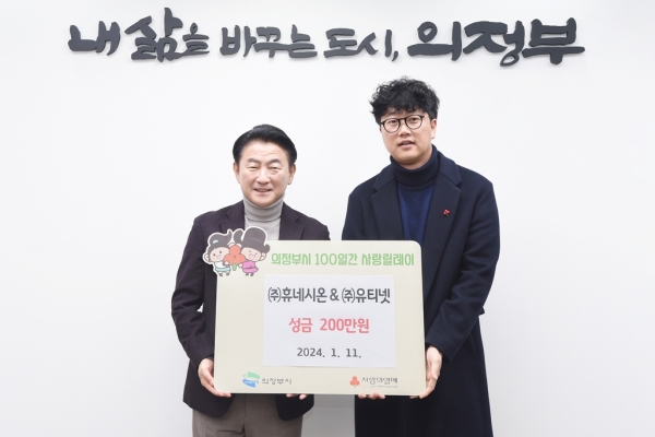 [금요저널] 의정부시는 1월 11일 ㈜휴네시온과 ㈜유티넷이 저소득층을 위한 성금 200만원을 전달하며 ‘100일간 사랑릴레이 배턴 잇기’에 동참했다고 밝혔다.