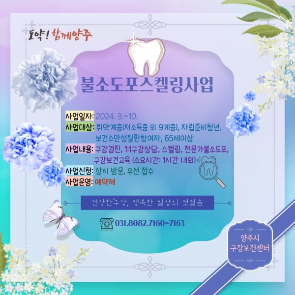 시 관계자는 “올해부터 확대 운영되는 ‘불소 도포 스케일링 사업’에 적극적으로 참여해 꾸준한 구강 건강관리를 하시길 당부드린다”며 “앞으로도 양주시 구강보건센터에서는 양주시민의 구강 건강 증진을 위해 노력할 것”이라고 말했다.
