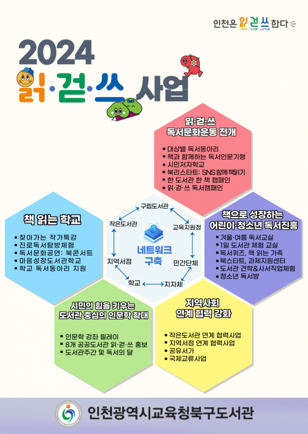 [금요저널] 인천광역시교육청북구도서관은 2024년 읽걷쓰 사업 추진을 위해 작은도서관, 지역서점, 민간단체, 학교, 지자체 등과 연계해 다양한 독서문화진흥사업을 펼친다고 18일 밝혔다.