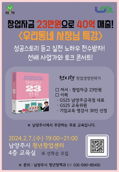 이번 교육은 남양주 시민으로 금곡동에서 편의점 사업을 성공시킨 사업가이자 경영필독서 ‘창업자금 23만원’의 저자인 전지현 대표가 자유로운 분위기 속에서 성공스토리와 실전 노하우를 공유하고 지역의 후배인 청년들과 소통하는 토크콘서트 형식으로 진행될 예정이다.
