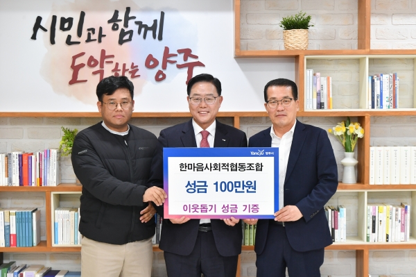 [금요저널] 양주시는 지난 17일 한마음사회적협동조합과 탑라이팅에서 시청을 방문해 양주시 어려운 이웃을 위해 써달라며 각각 성금 100만원과 200만원을 기부했다고 밝혔다.