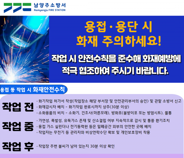[금요저널] 남양주소방서는 겨울철을 맞아 공사장 내 용접·용단 작업 중 불티로 인한 화재에 각별한 주의를 당부했다.