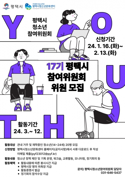[금요저널] 평택시청소년문화센터는 2024년에 함께 활동할 평택시청소년참여위원회 17기 신입 위원을 모집한다.