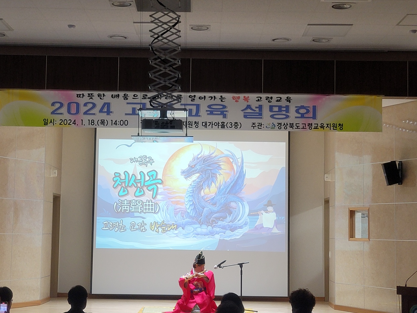 이날 설명회는 고령초 교감의 ‘청룡을 깨우는 우리 가락 대금 연주’공연을 시작으로 2024년도 고령교육 비전 및 지표, 4대 정책 방향에 대한 설명과 함께 고령 핵심 추진과제에 대하여 자세히 안내하였다.