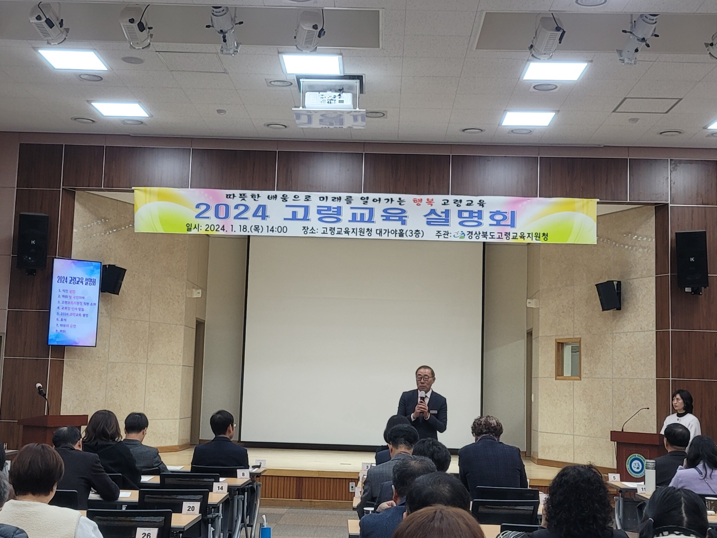 경상북도고령교육지원청(교육장 김호상)은 2024년 1월 18일(목)에 관내 유·초·중·고등학교 교(원)장 및 각 학교 운영위원장, 학부모회장과 교육지원청 관계자 등 60여명이 참석한 가운데 ‘따뜻한 배움으로 미래를 열어가는 행복 고령교육’실현을 위한 「2024 고령교육 설명회」를 개최하였다.