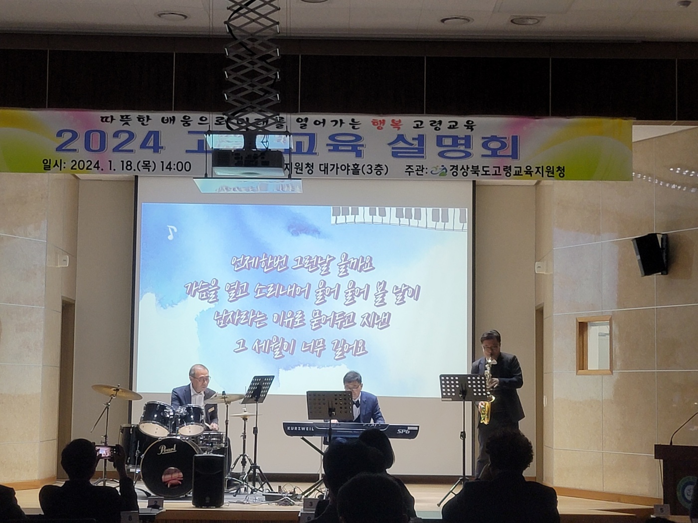 설명회의 마지막은 고령교육을 위해 귀한 시간을 내어 참석한 학부모들을 위하여 고령교육지원청 교육장, 고령중 교장, 우곡중 교장이 함께 밴드 공연으로 감사의 마음을 전하였다.