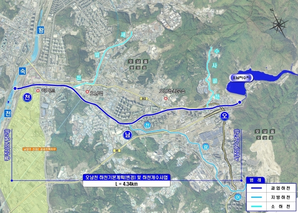 이번 오남천 하천기본계획 수립 연장은 오남저수지 여수로 하단에서 왕숙천 합류부까지 총연장 4.34㎞로 시는 하천 제방, 호안 등 하천시설을 정비하고 오남저수지와 왕숙천을 산책로를 연결해 주민들의 하천 공간 내 친수·문화공간 이용 수요에 부응할 계획이다.