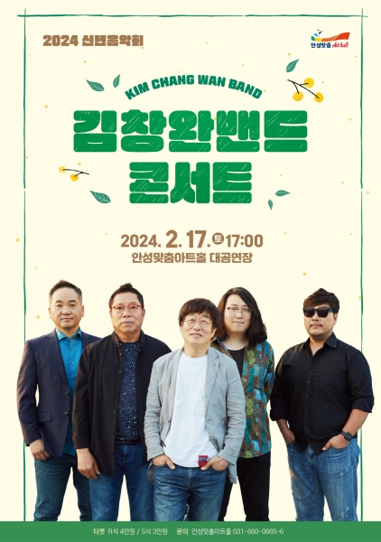 다양한 관객층이 함께 어우러지는 2024 신년음악회 ‘김창완밴드 콘서트’의 티켓 가는 R석 40,000원, S석 30,000원이며 안성 시민은 15% 할인이 적용된다.