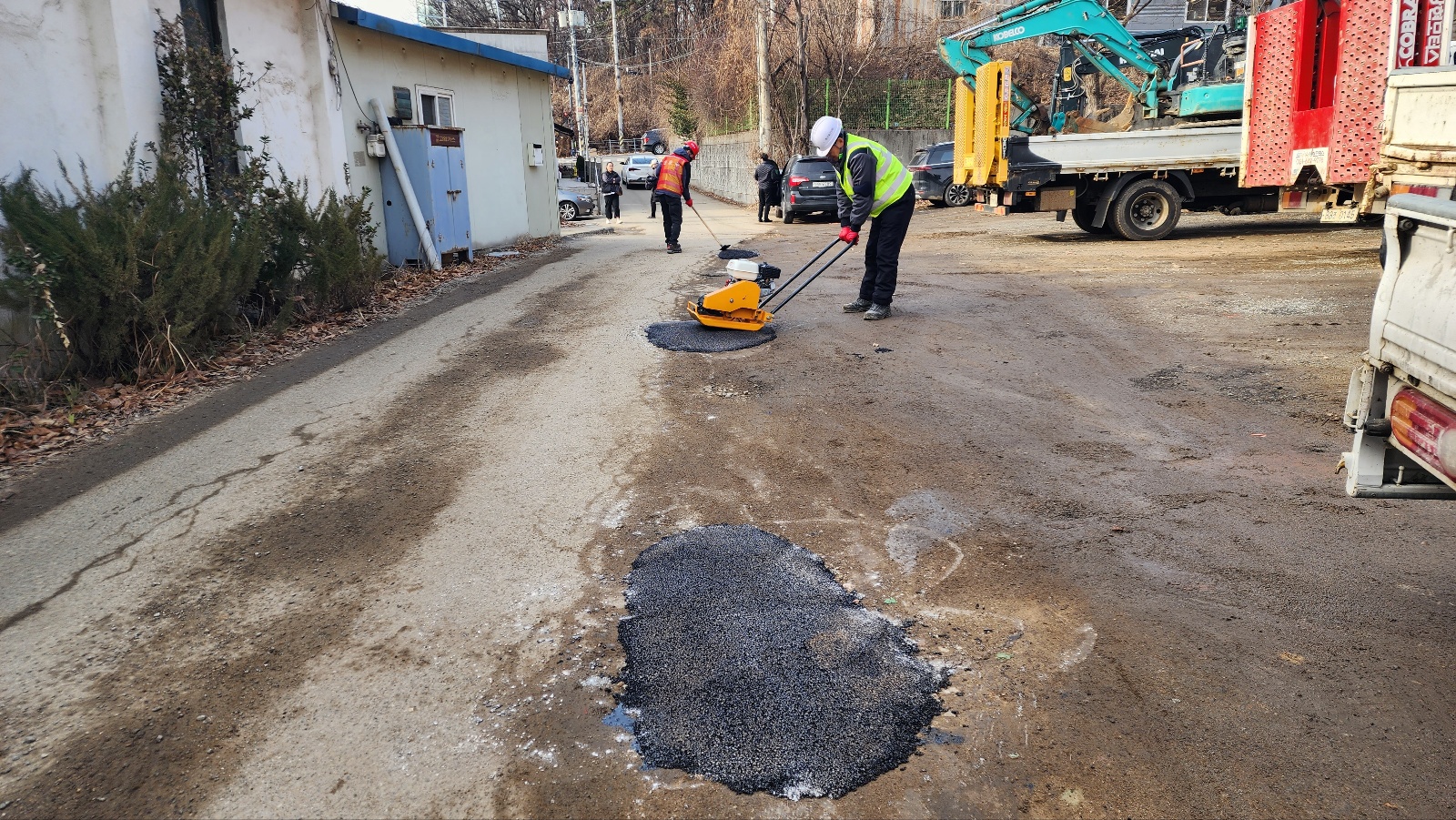 #2 박기용 기흥동장은 지난 16일 현장 순찰 중 오전 10시 공세동 642번지 일대 도로 파손을 신고했다. 한 시간 반이 지난 11시 30분 구 관련 팀은 “해당 지역은 사유지와 국유지가 혼합된 부분으로 파손이 심한 곳에 대해 긴급조치를 완료했다”며 관련 사진을 전송했다.