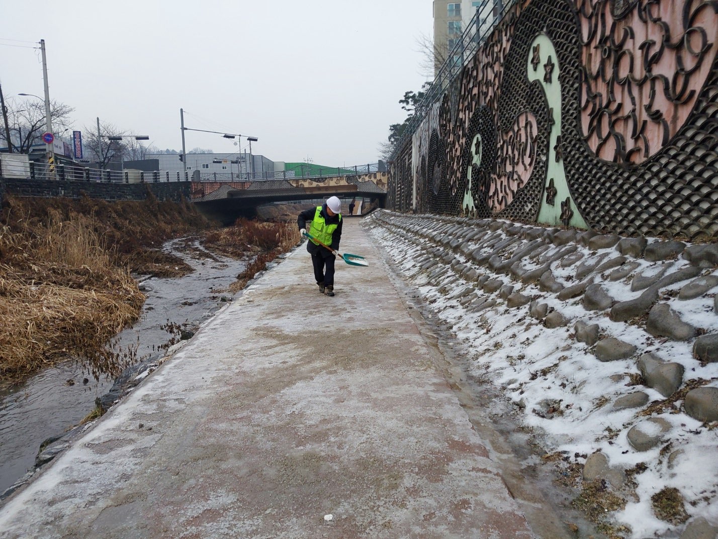 #1 김요한 용인특례시 기흥구 상하동장은 지난 17일 오후 4시 구 ‘생활행정톡’에 상하천 산책로 빙판길 사진을 올리며 주민의 안전을 위해 빠른 조치를 요청했다. 구 관련 팀에서는 4시 25분 “해당구간 모래 포설(살포)을 완료했고 우천으로 인해 오늘 상하천 전체 점검 및 미비 구간 조치 예정”이라고 회신했다.