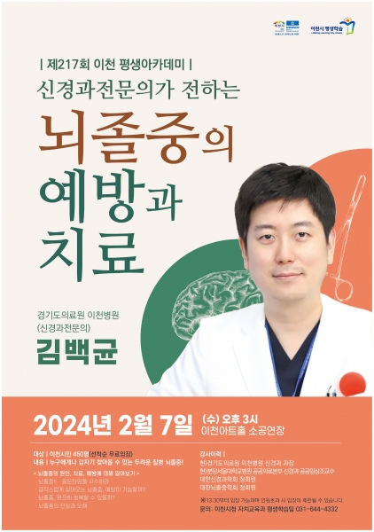 [금요저널] 이천시는 다음달 7일 이천아트홀 소공연장에서 김백균을 초청해 ‘뇌졸중의 예방과 치료’를 주제로 ‘제217회 이천 평생아카데미’를 개최한다.